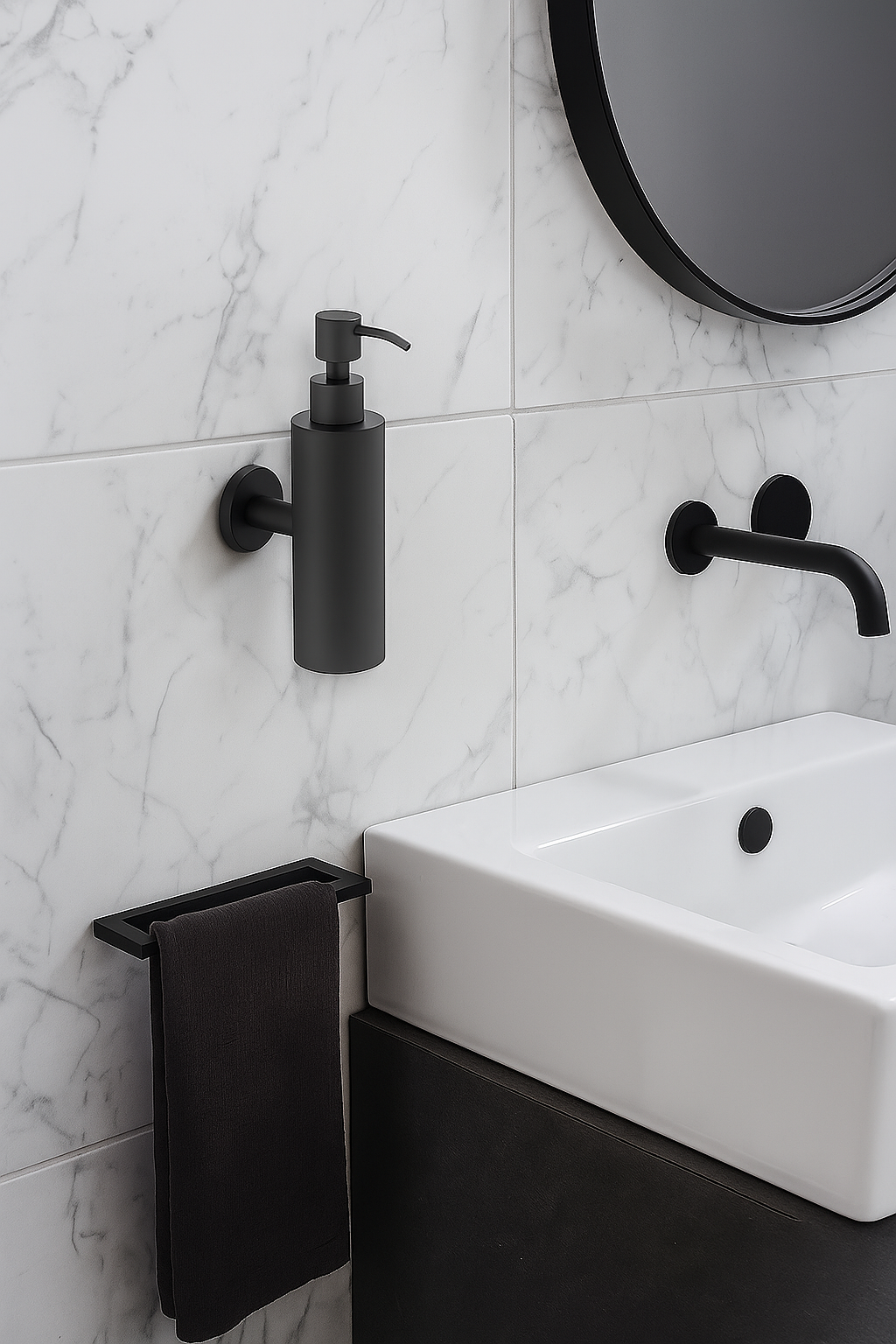 Verleihen Sie Ihrem Badezimmer ein Upgrade mit dem TOJ Living Seifenspender zur Wandmontage (200 ml, matt-schwarz) – Hygiene trifft auf Design. Jetzt bestellen!