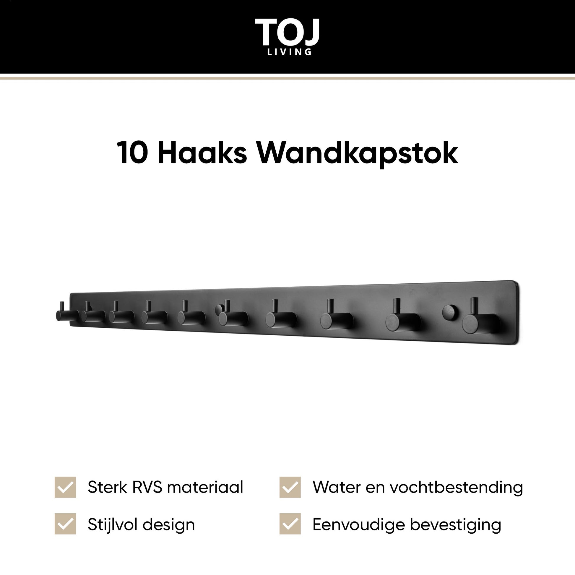 Die TOJ Living Wandgarderobe in Matt-Schwarz aus Edelstahl, rostfrei kombiniert Stil mit Funktionalität. Mit 10 Haken bietet diese moderne Garderobenleiste reichlich Platz für Jacken, Taschen, Handtücher oder Accessoires – eine ideale Wahl für ein aufgeräumtes Zuhause.