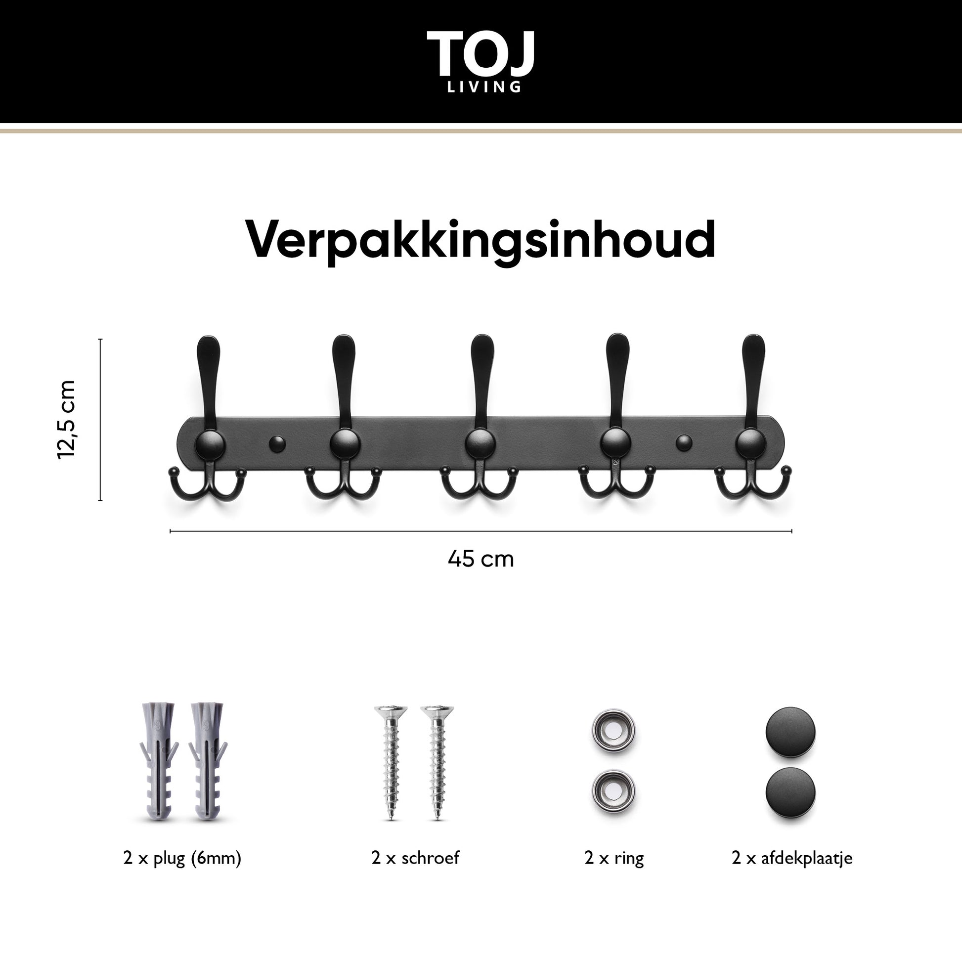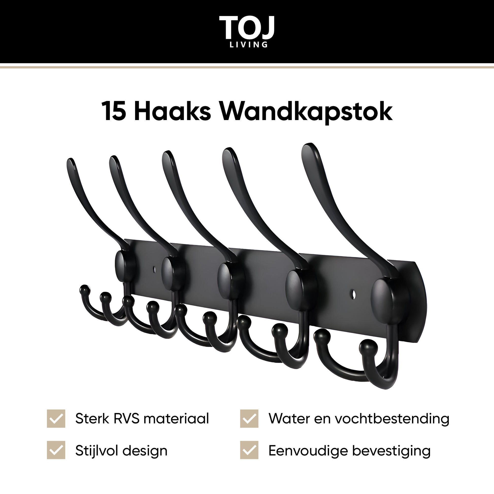 1× TOJ Living Wandgarderobe – Matt-Schwarz (15 Haken, 45 cm)