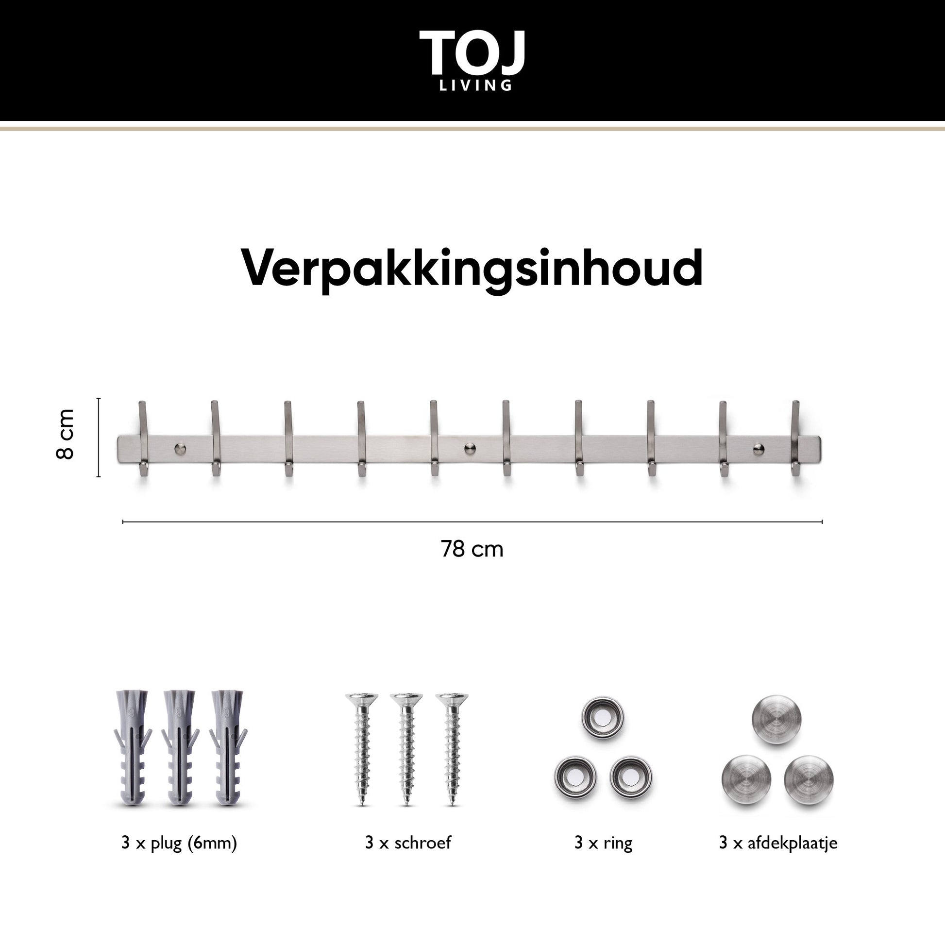 Bringen Sie Ordnung und Stil in Ihr Zuhause mit der TOJ Living Wandgarderobe in gebürstetem Edelstahl (20 Haken, 78 cm). Jetzt bestellen!